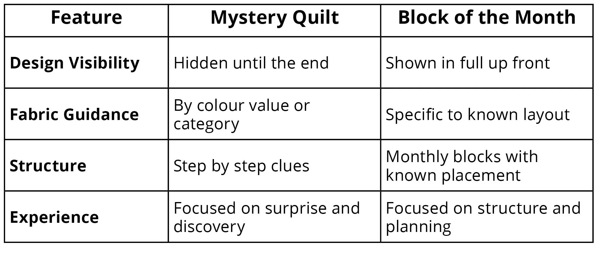 If you've ever searched for "mystery quilt" or "sew along," or wondered what makes a “Block of the Month” different from a mystery quilt, you're in the right place.